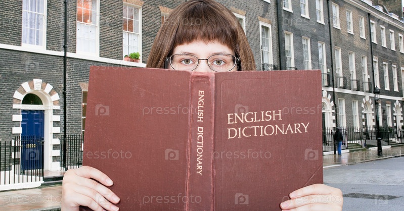 Девочка смотрит на английский словарь и улица