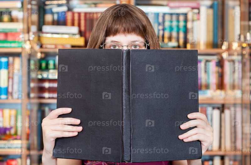 Девушка читает большая книга в библиотеке