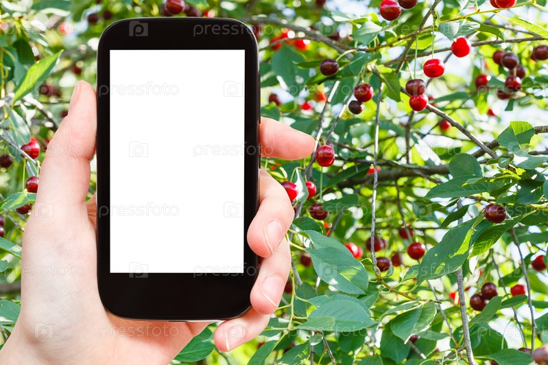 Смартфон и дерево с спелой вишни