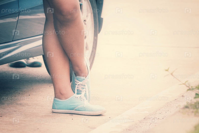Женщина с автомобилей на дороге и тапки
