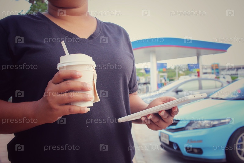 Женщина, используя таблетки с кофе бумажный стаканчик