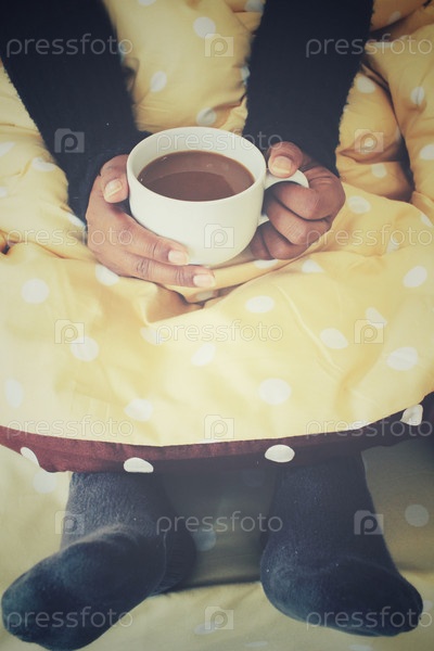 Женщина, пить кофе на кровати
