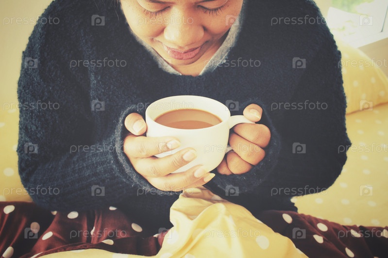 Женщина, пить кофе на кровати