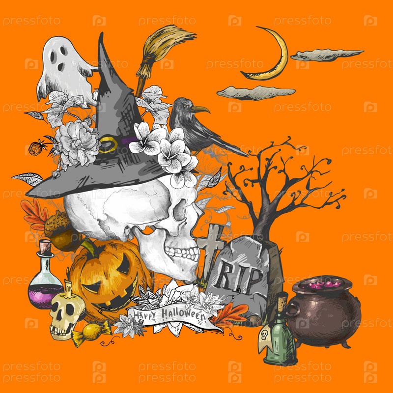 Старинные рисованной Хэллоуина пригласительная открытка с черепом