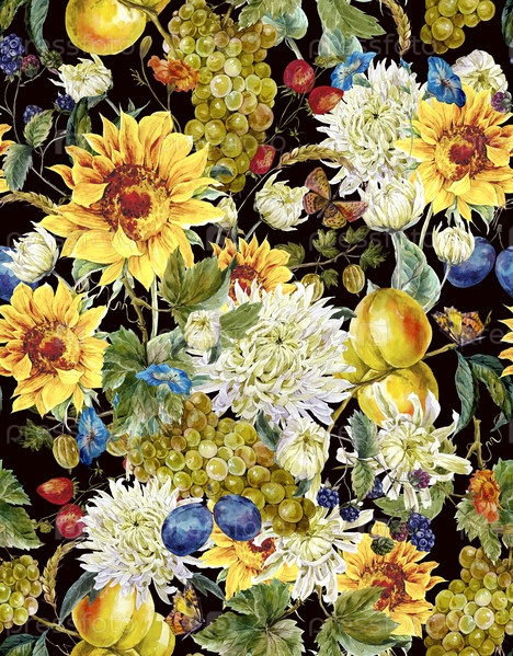 Акварель фон с хризантемами, фрукты, солнце