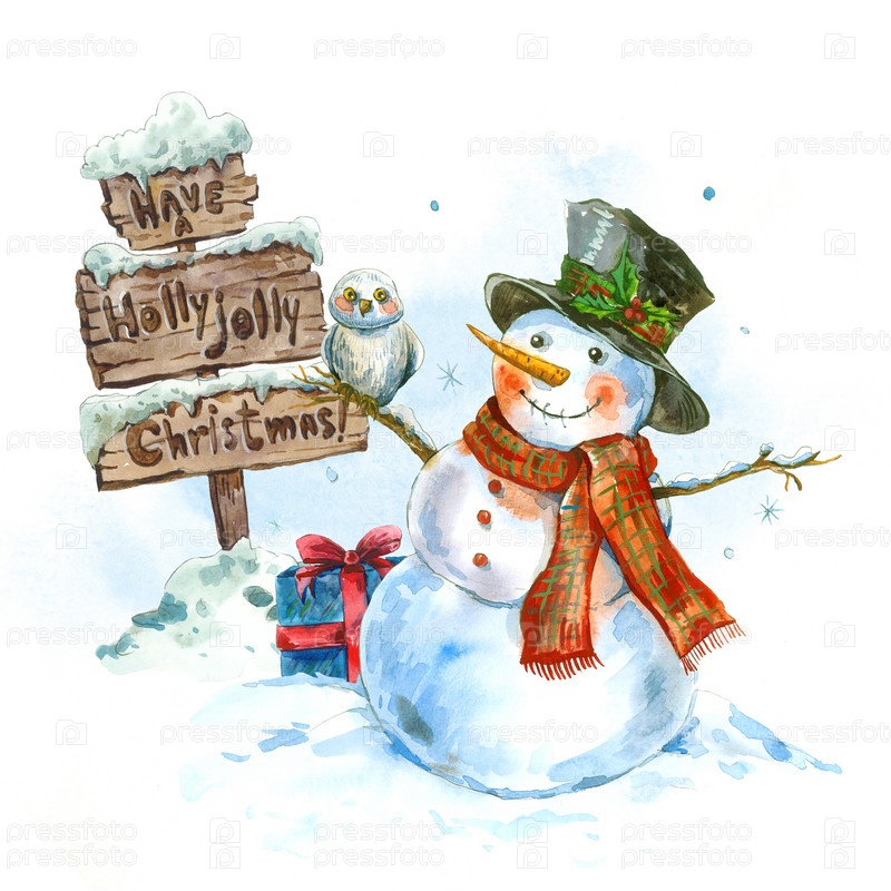 Акварель открытка со снеговиком