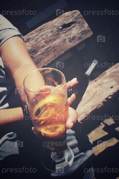 Бокал бренди с смартфон с стороны
