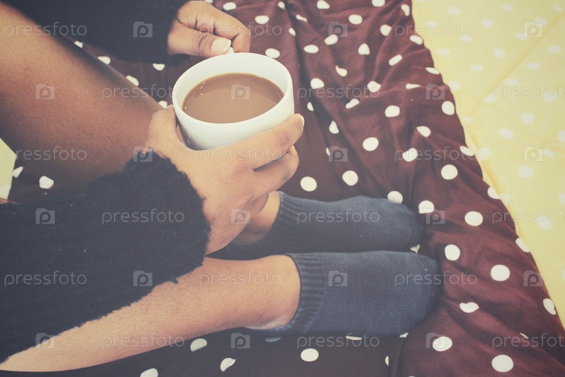 Женщина, пить кофе на кровати
