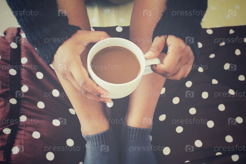 Женщина, пить кофе на кровати