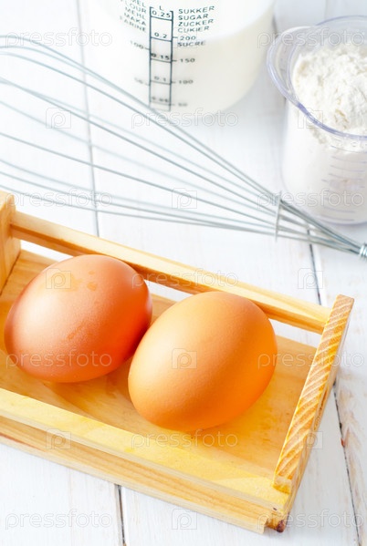 Ингредиенты для теста, яйца, муку и молоко