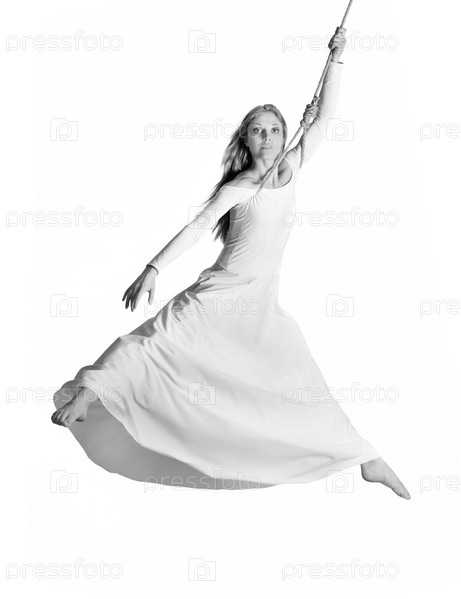 Гимнастка в белом платье на веревке