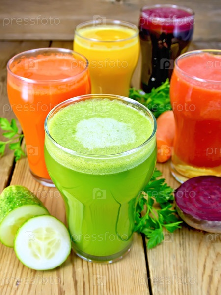 Овощные соки в стаканах на доске