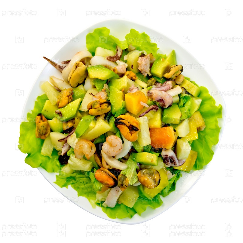 Салат из морепродуктов и авокадо в тарелке сверху
