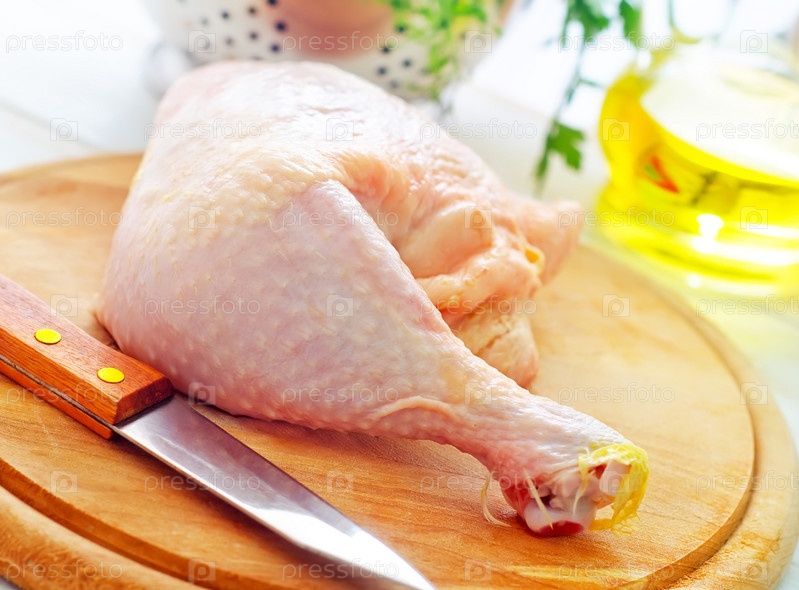 Сырые куриные и нож на деревянной доске