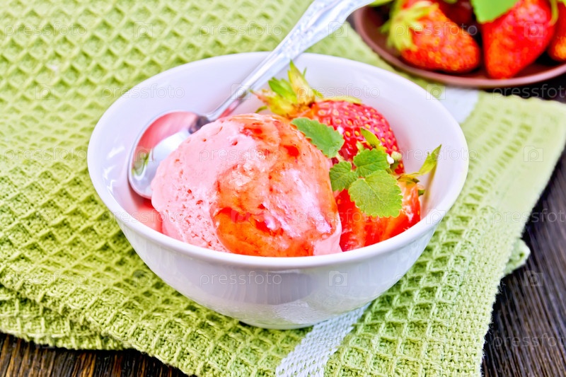 Мороженое клубничное с сиропом и мятой