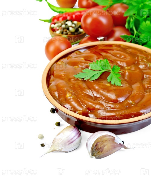 Кетчуп в глиняной посуде с овощами и специями