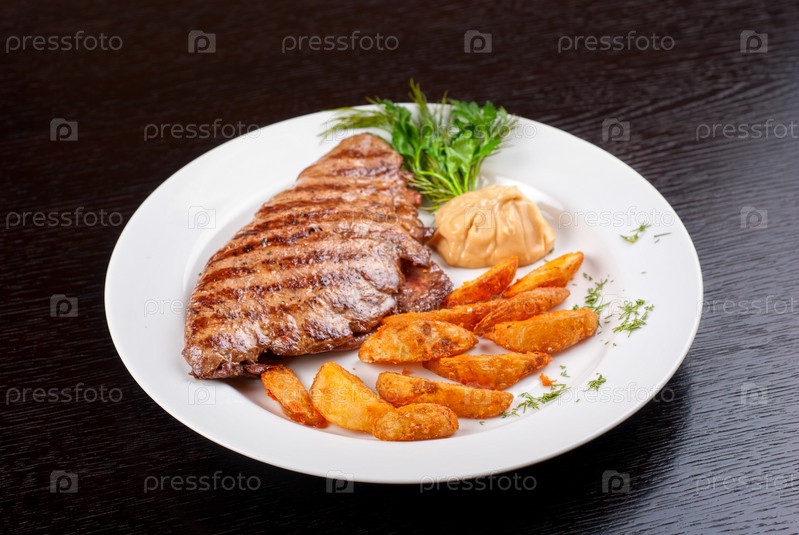 Сочный стейк говядины с картофелем, зеленью и соусом