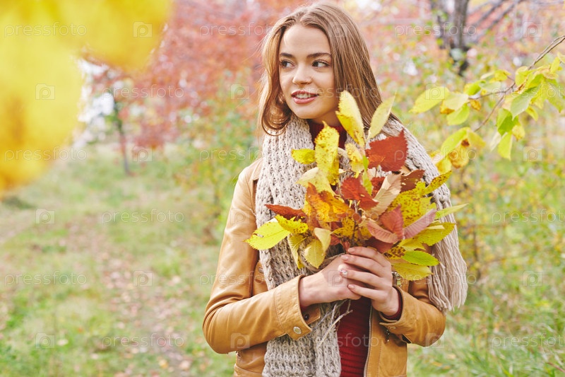 Девушка с букетом листьев