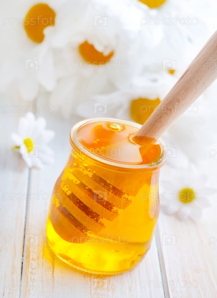 Свежего меда в стеклянной банке и ромашки