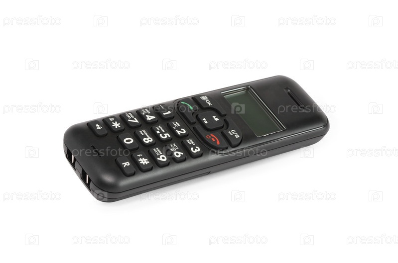Современный черный сотовый телефон на белом фоне