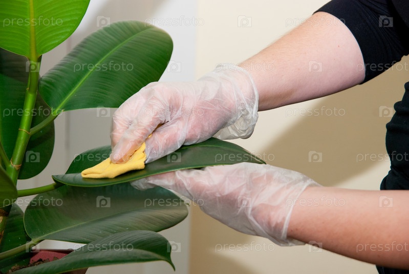 Девушка в перчатках протирает листья фикуса влажной губкой