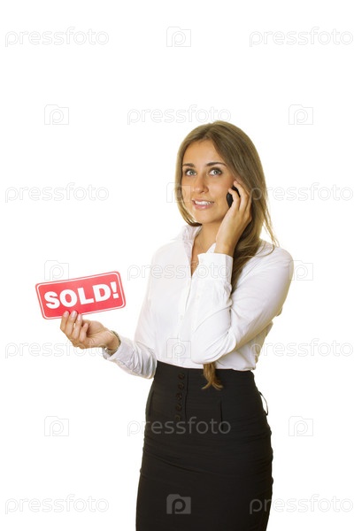 Деловая девушка разговаривает по телефону и держит в руке табличку с надписью "ПРОДАНО"