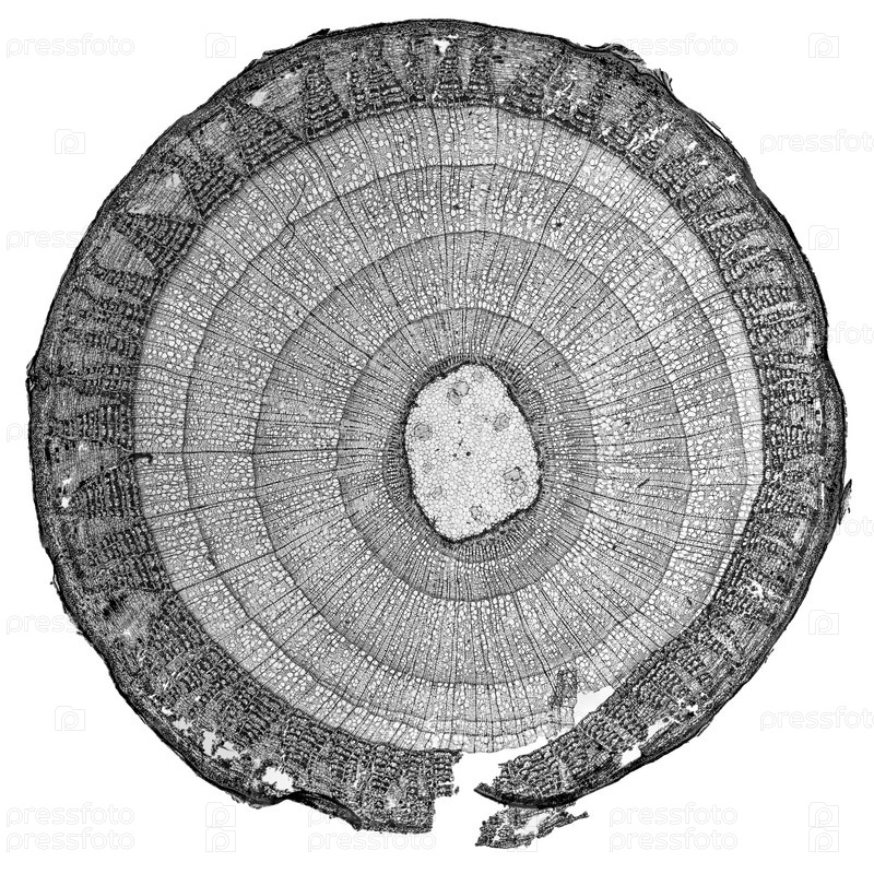 Поперечное сечение стебля липы вид через микроскоп в черно-белом