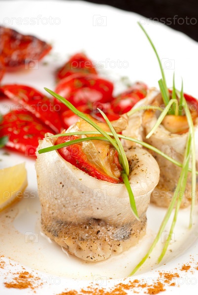 Филе судака, фаршированное форелью и овощами