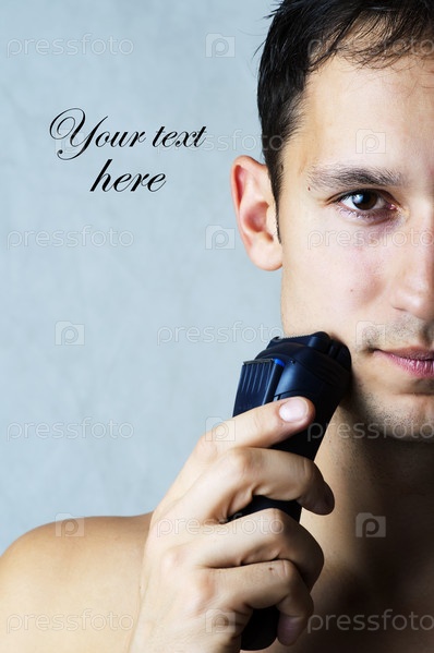 Модный портрет человека бреющий электрической бритвой подбородок и щеки. Мужская гигиена