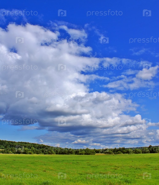 Летний пейзаж с облачным голубым небом, зеленой травой и деревьями