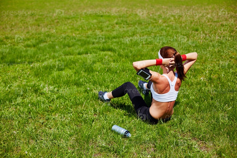 Девушка качает пресс на свежем воздухе