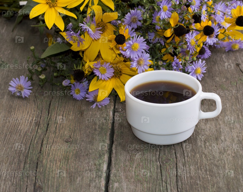 Натюрморт с чашкой кофе и цветами