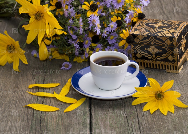 Натюрморт с чашкой кофе и цветами