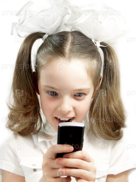 Маленькая девочка с хвостиками заинтересованно рассматривает мобильный телефон
