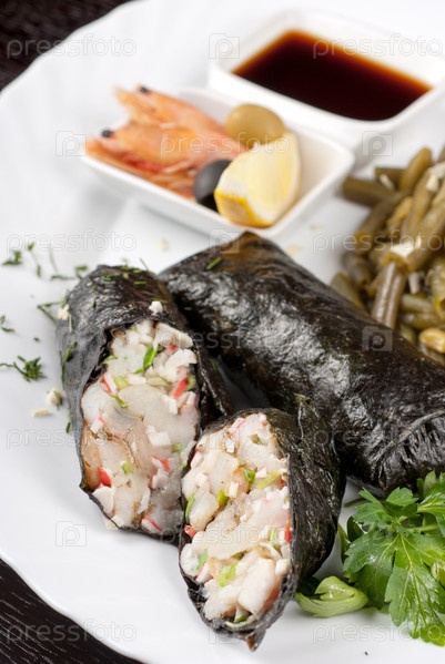 Суфле из филе судака, креветки, крабовое мясо и лук-порей завернутый в нори