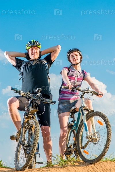 Пара велосипедистов в шлемы на велосипедах позирует