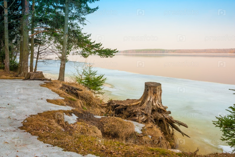 Пенек на берегу озера
