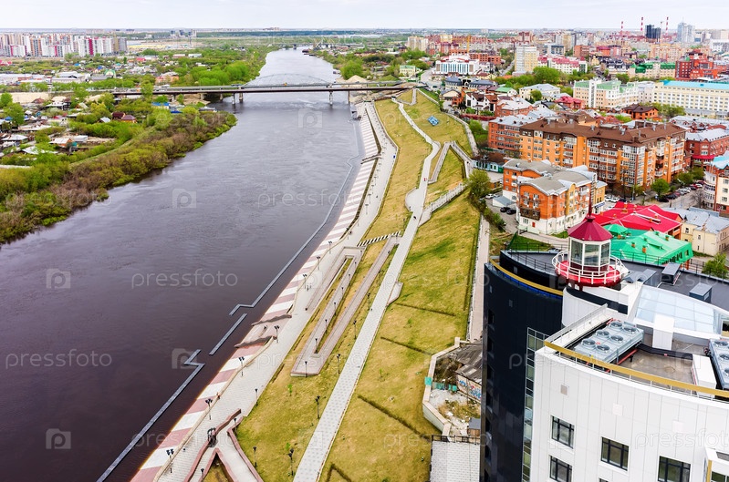 Пешеходная набережная и мост через реку Тура. Тюмень