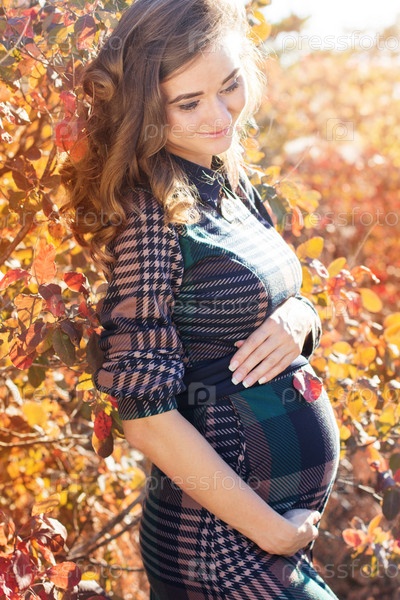 Молодая беременная женщина в осеннем парке