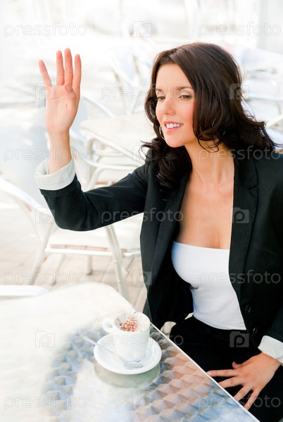 Красивая женщина в деловом костюме пьет кофе в кафе