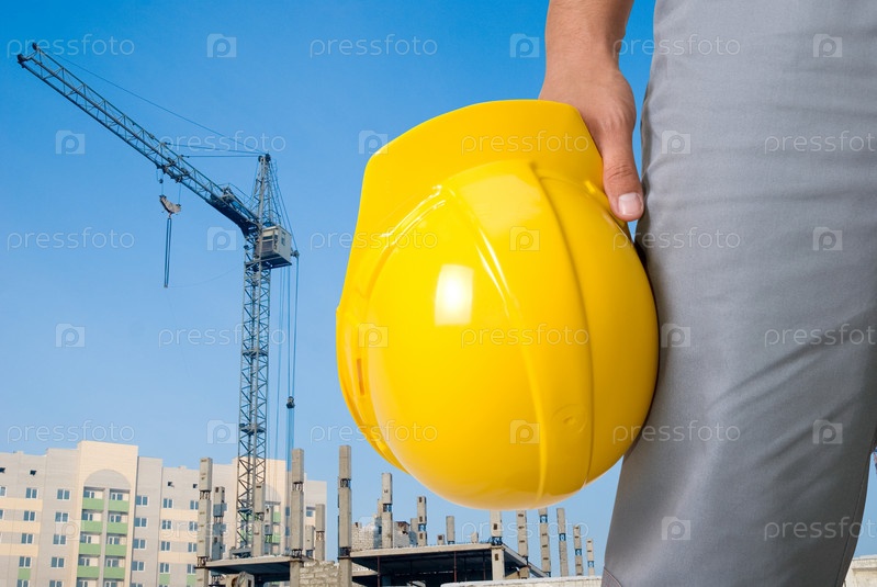 Каска в руке строителя на фоне строящегося дома