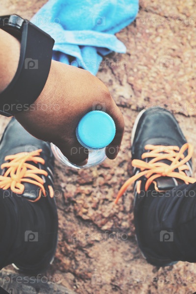 Селфи спортивной обуви с бутылкой воды