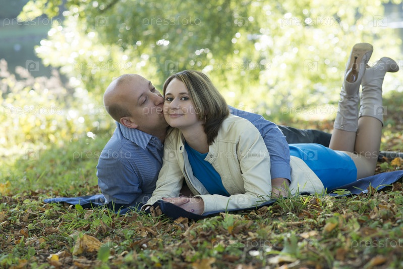 Влюбленная пара в парке на траве в солнечный осенний день