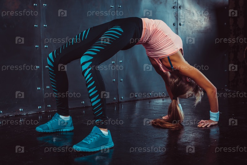 Девушка делает физические упражнения в комнате с железными стенами