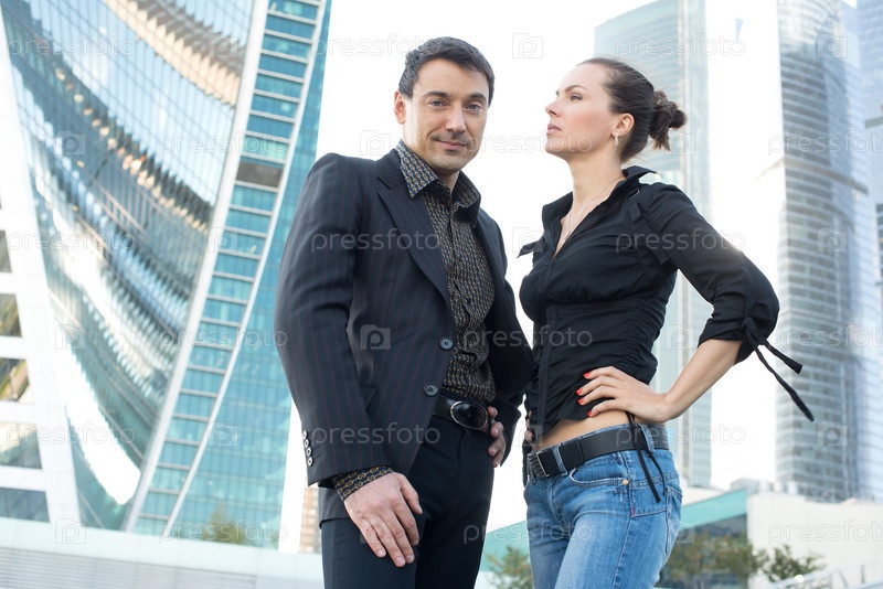 Мужчина и девушка на фоне офисных зданий