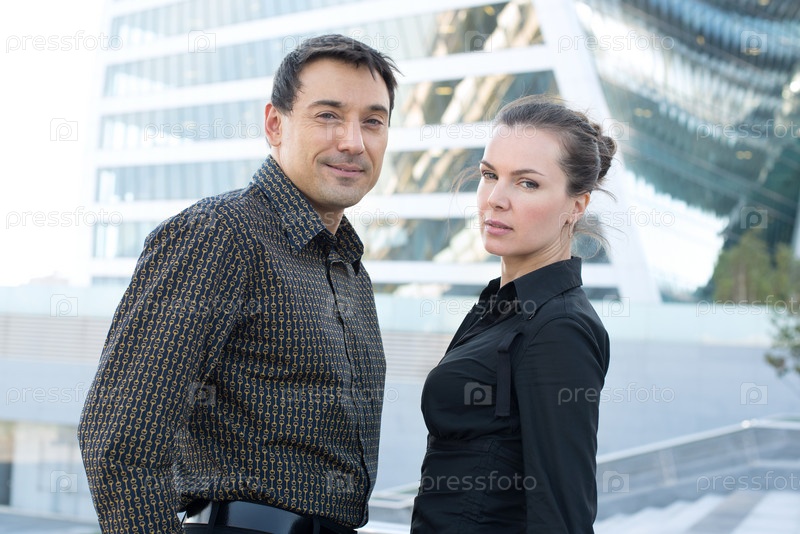 Мужчина и девушка на фоне офисных зданий
