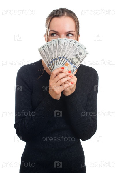 Довольная женщина с веером из долларов