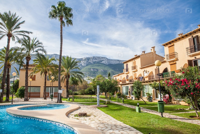 Бассейн с пальмами и видом на горы