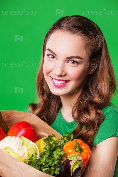 Красивая женщина держит продуктовый мешок с свежей и здоровой пищи