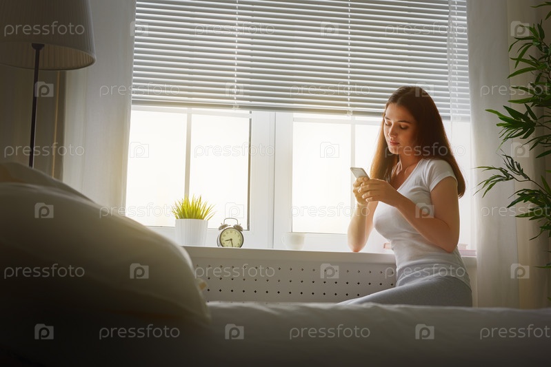 Девушка сидит на кровати с телефоном